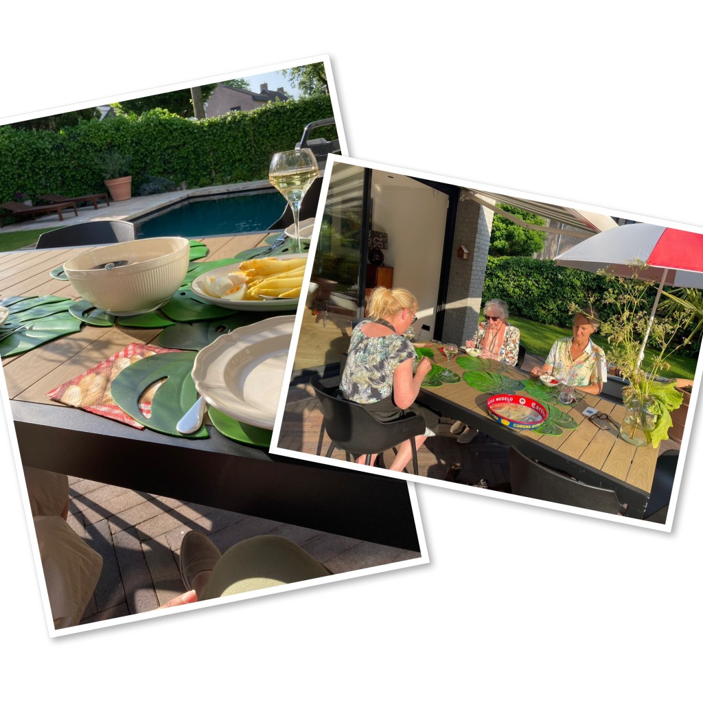 Zoals je ziet ,weer aan mogen schuiven, en natuurlijk weer die heerlijke asperges,zachtjes aan begint dit asperges seizoen af te tikken , nog een kleine maand ,mogen we er nog van genieten .