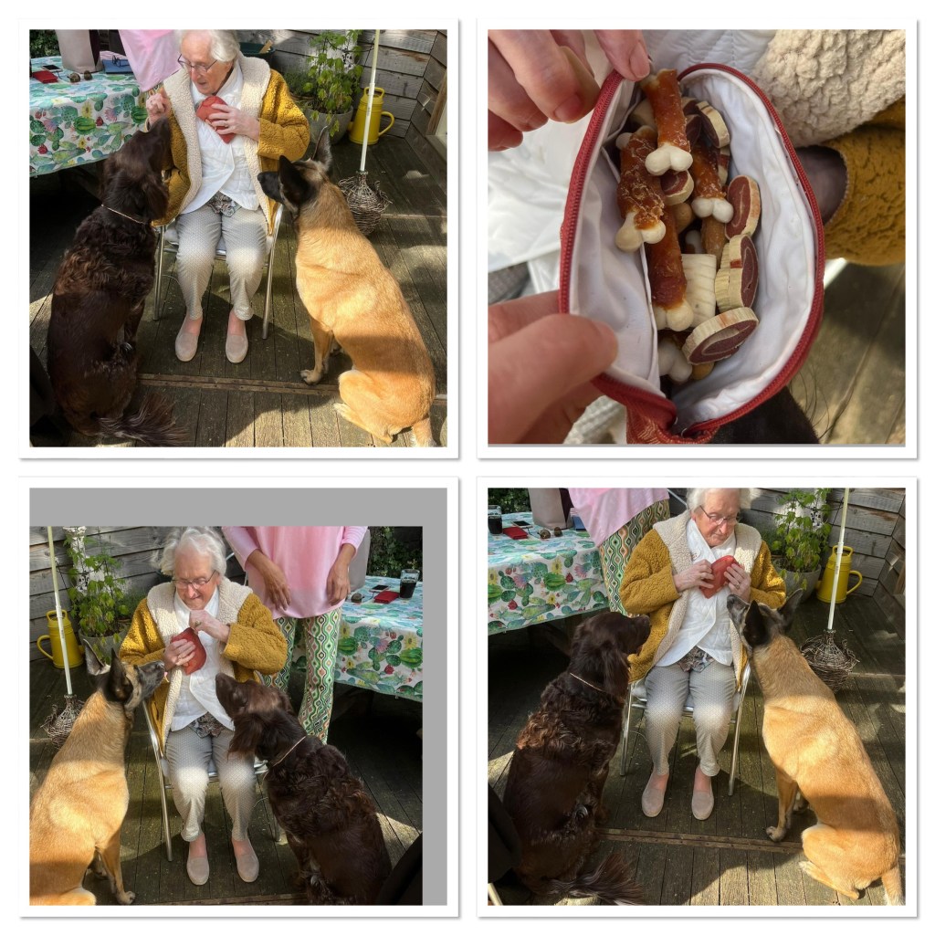 Dit is het ritueel van gisteren , Bonnie en Wout de honden van kinderen en kleinkinderen zien ze mij , dan is het meteen ja dat mens is van de snoepjes , en verder gaan is nu ,