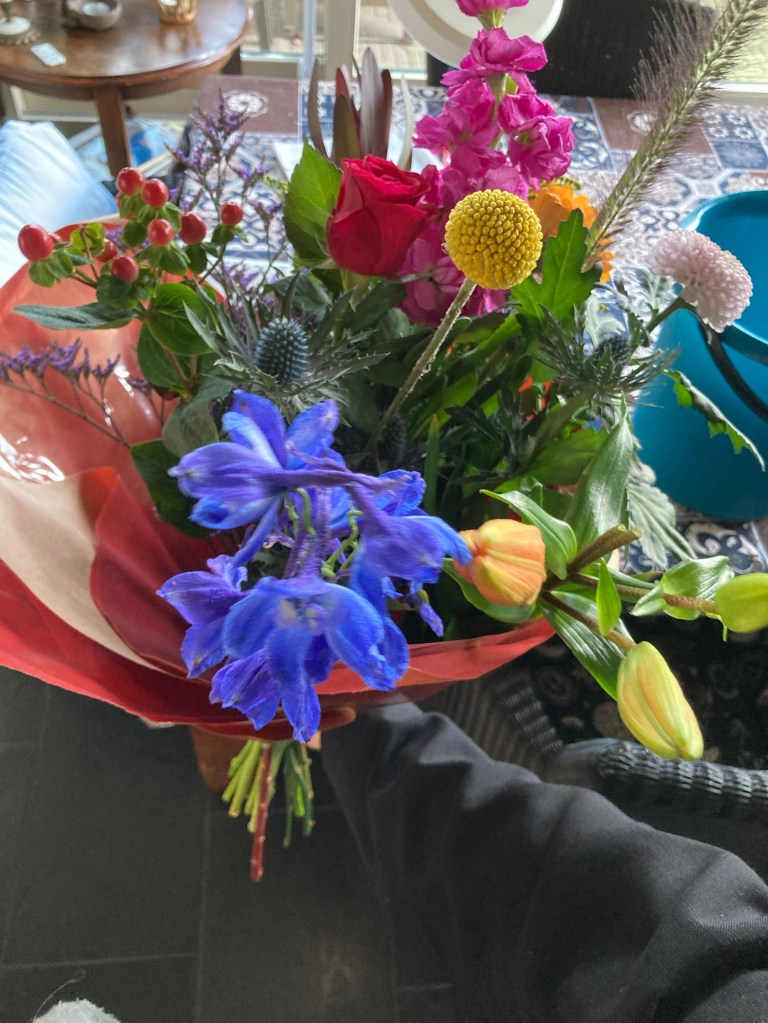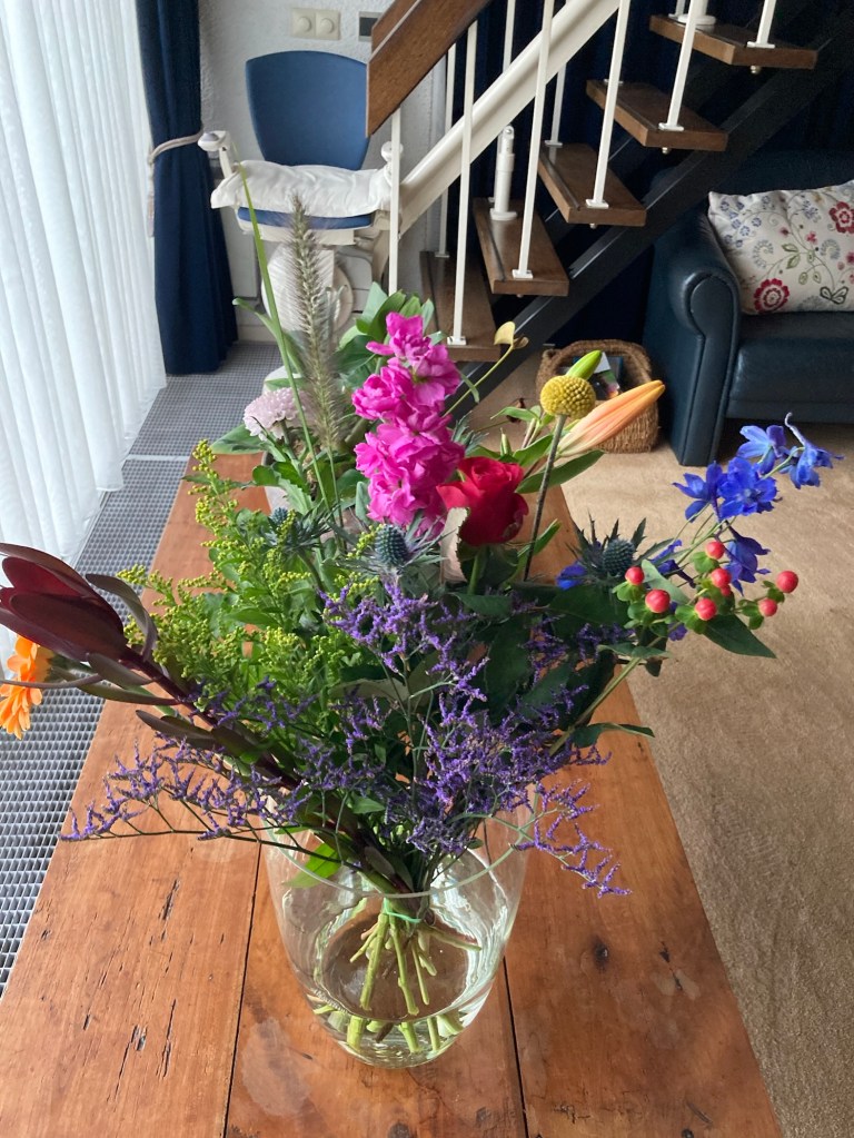 De bezorger van de bloemen ,is altijd zo ongeduldig ,ik moet mijn rollator in werking stellen ,